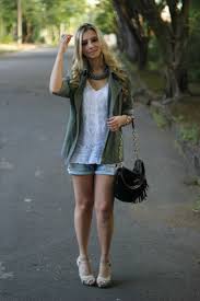 Composto por:camiseta básica branca, short jeans, casaquinho verde "musgo", maxi colar, bolsa preta com detalhes dourados, sapato anabela o look está AR-RA-SAN-DO.